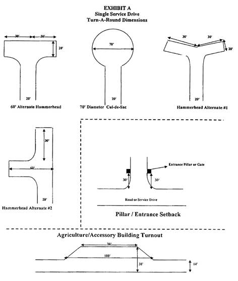 (d)   Service Drives over five hundred feet (500’) in length must have an Approved Turnout which is not less than thirty feet (30’) wide and seventy feet (70’) in length for every five hundred feet (500’) in length. The approved turnout must comply with the minimum dimensions and requirements found in Exhibit A.